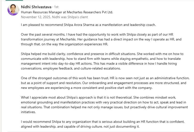One of the most profound transformations I witnessed this year came from a client who worked closely with me during her organisation’s HR transformation journey. She is a leader in her organisation, yet when she first came to me, she felt invisible at her workplace – underconfident, doubtful, and constantly overwhelmed. Through a powerful blend of NLP techniques, leadership coaching, manifestation practices, and emotional intelligence work, she rewired her inner dialogue and stepped into a new identity of confidence, clarity, and calm authority. She learned how to communicate effectively with leadership, stand firm with empathy, handle hiring conversations, manage cultural escalations, and translate management intent into daily HR actions. The ripple effect has been incredible – the HR function is now viewed not just as an administrative unit, but as a trusted centre of support, structure, and engagement. This energetic and behavioural shift has led to improved onboarding, stronger employee trust, and a noticeably more positive workplace culture.
